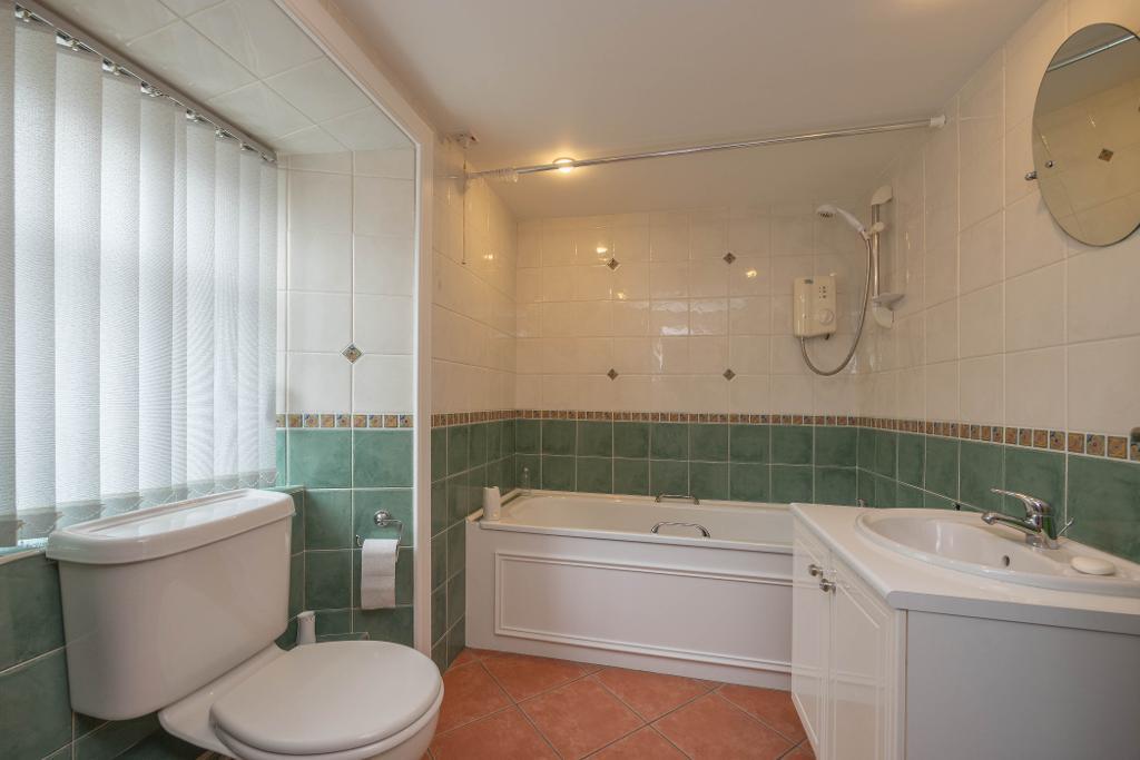 The bathroom includes wc, wash hand basin with vanity unit below, bath with electric shower and shower rail above. Fitted cabinet. Towel style radiator. Tiled walls and floor. Window offering natural light and ventilation.