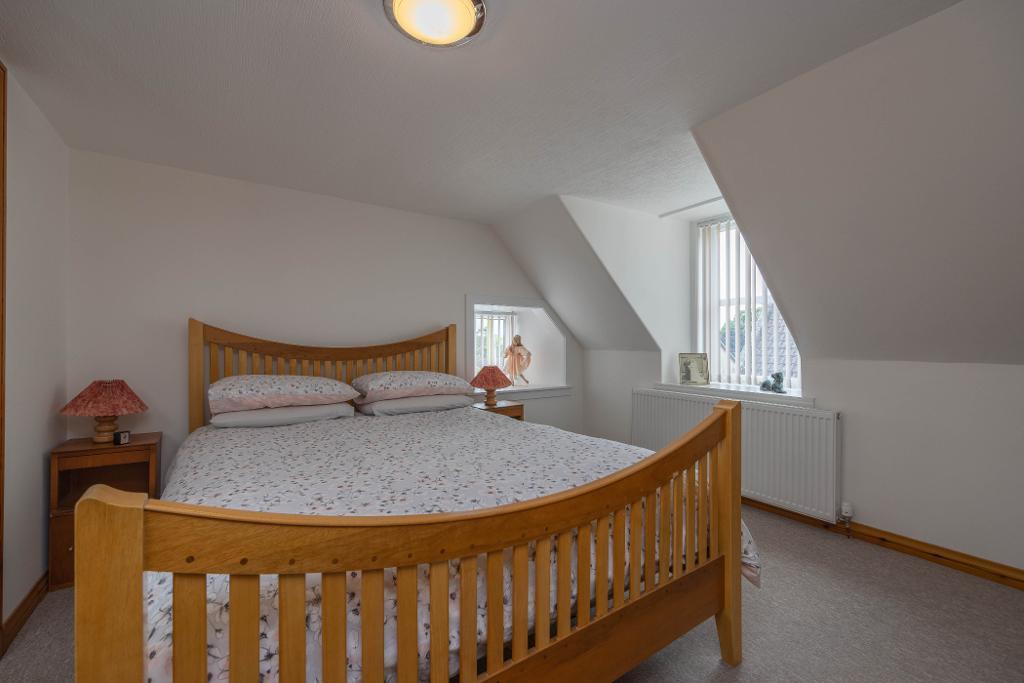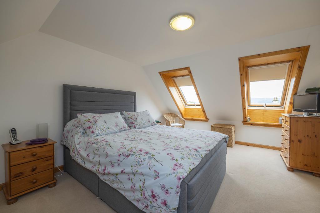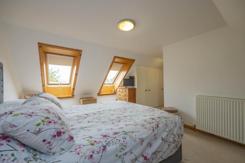 Master bedroom is generous in size with space for double bed and free standing furniture. Fitted low level cupboards with dressing table. Fitted wardrobes. Fitted carpet. Two Velux windows offering views over roof tops towards the East & West Lomonds. A door provides access to en-suite.