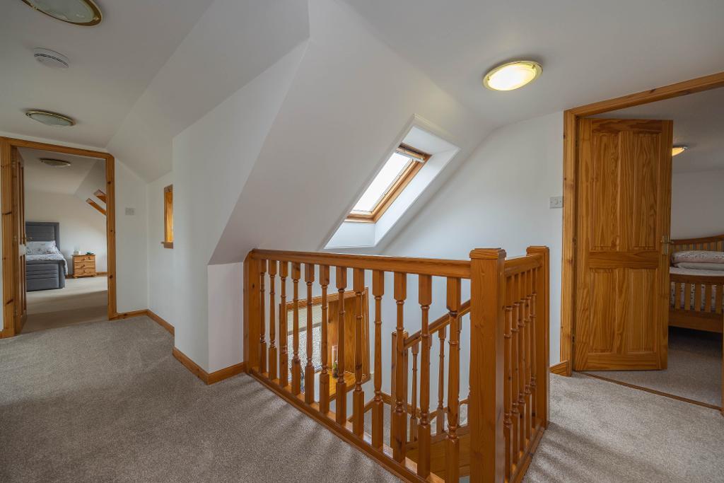 Carpeted staircase with fixed glass pane and velux window allowing natural light into the stairwell. The carpeted upper landing provides access to four bedrooms. Balustrade area overlooking the breakfast bar area of the kitchen. Window provides view over roof tops towards The East Lomond.