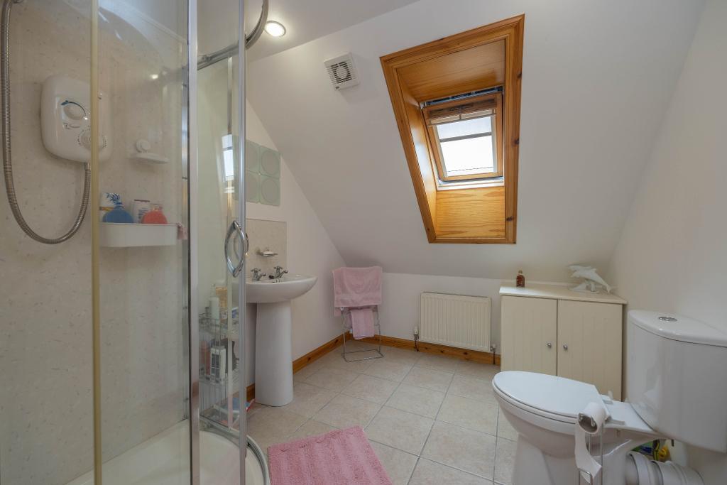 En-suite shower room includes, wc, wash hand basin with splashback panel and four mirrors above. Corner shower cubicle with power shower. Tiled floor. Velux window offering natural light and ventilation.