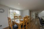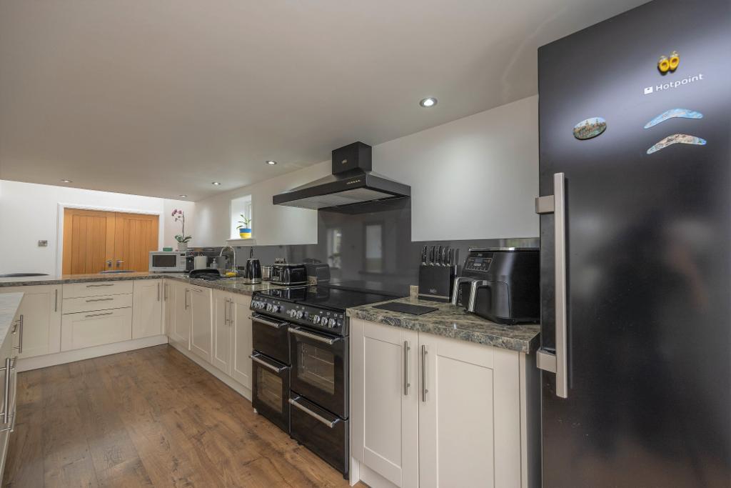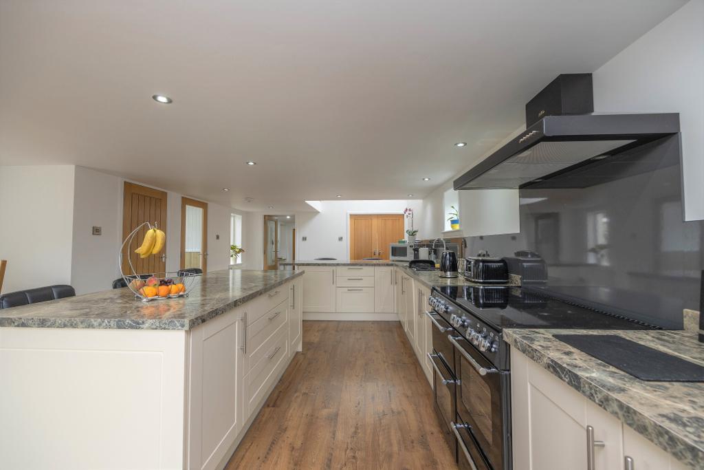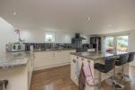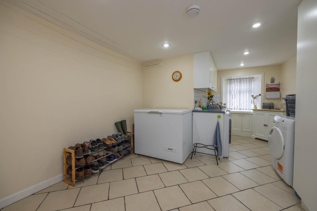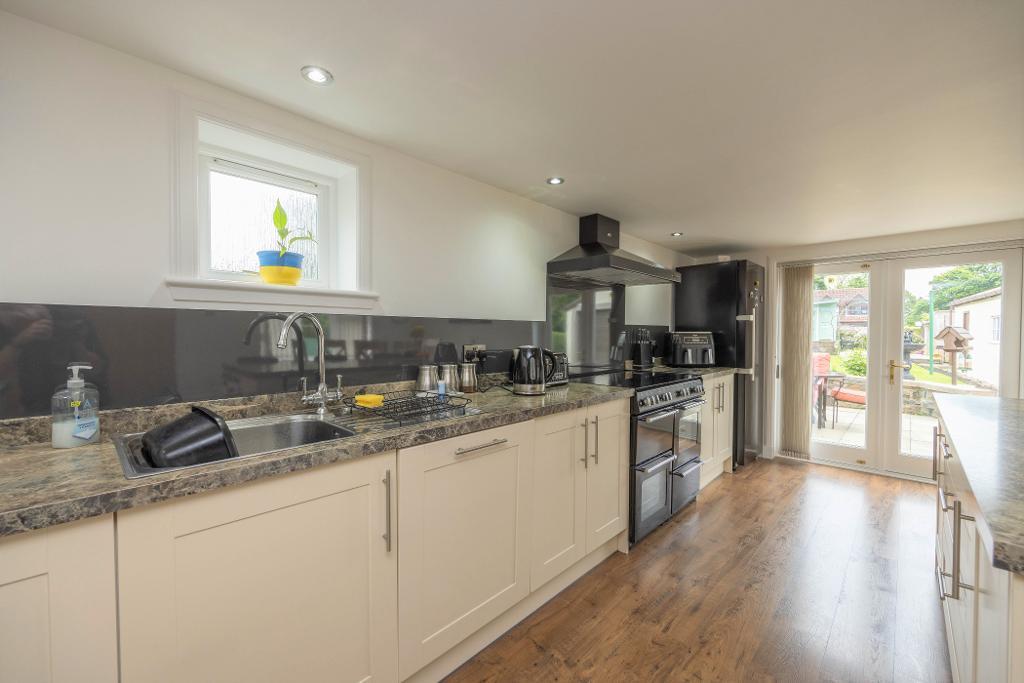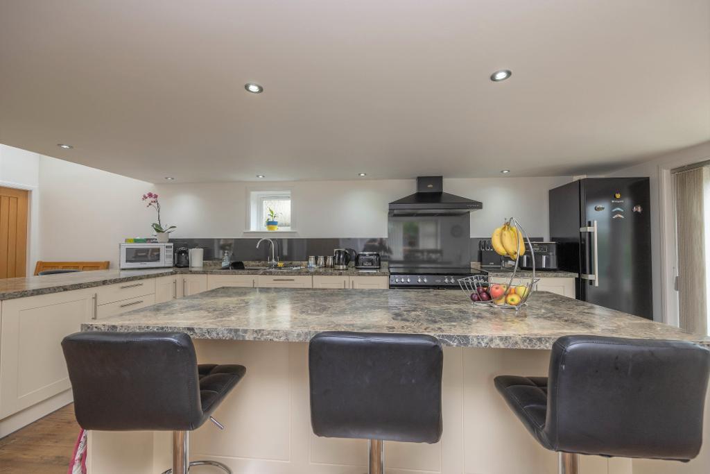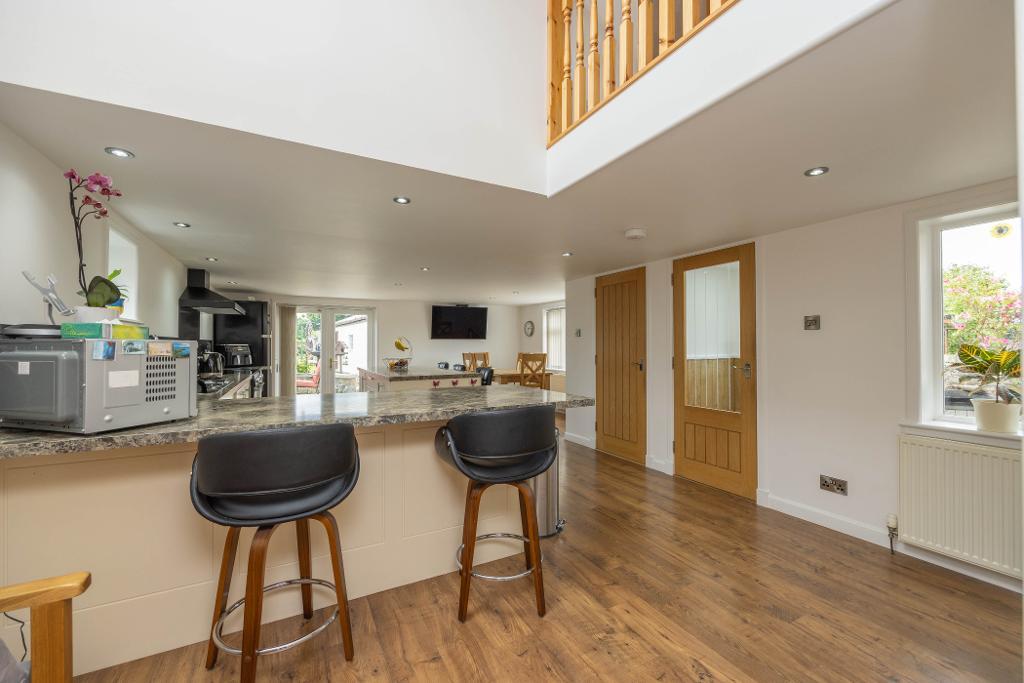 Beautifully finished dining kitchen with fitted base mounted units, ample worktop space and splash back wall paneling. Breakfast bar area, with high ceiling and Velux window above. Kitchen island breakfast bar with drawers. Seven ring gas burner range cooker with grill, double oven, storage and glass lid. Integrated dishwasher. Free standing fridge. Walk in cupboard with power and light offering a great storage area. Dining area with window to side. Two further windows providing additional natural light. French doors open onto the rear patio. Door to side entrance vestibule, with further door to garden area. Double doors to utility. Laminate flooring.