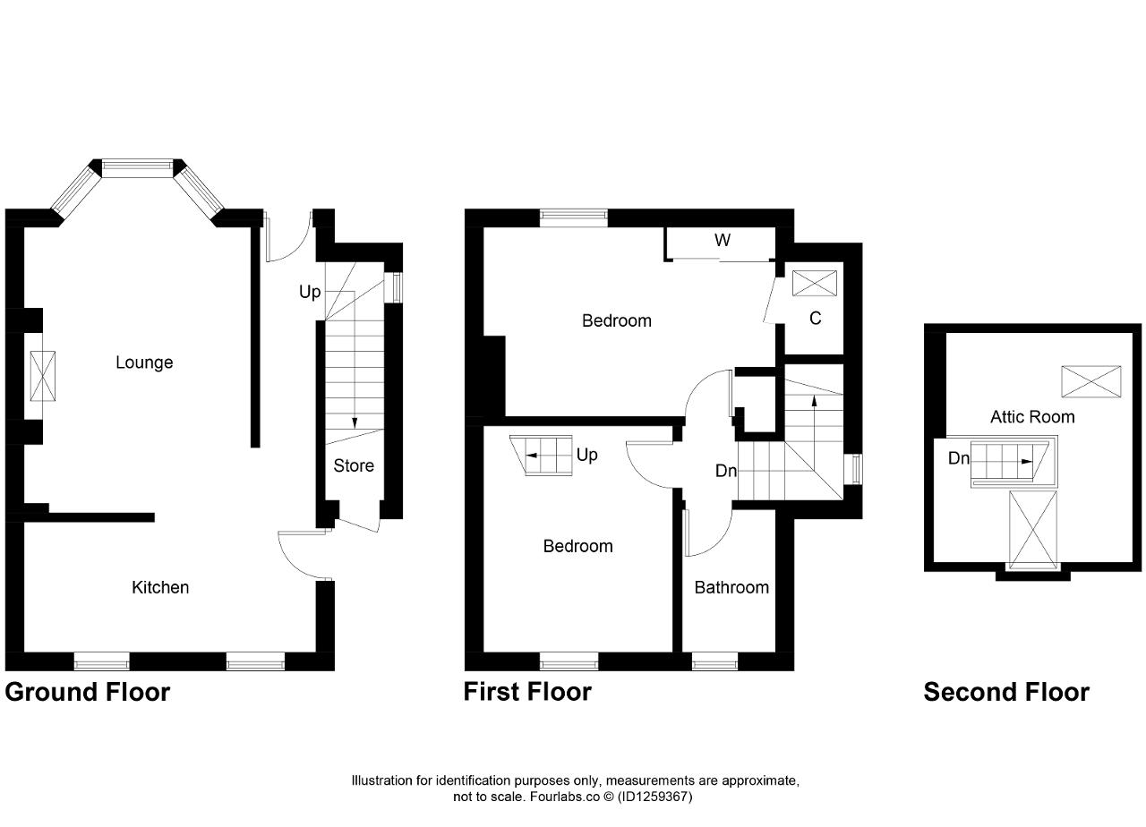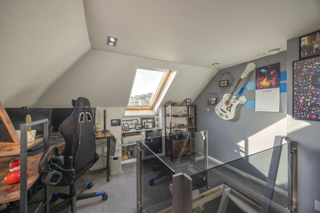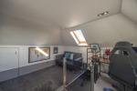 Bedroom two is located to the rear of the property and is presently being utilised as a child"s nursery, however, there is ample space for double bed and free-standing furniture if this is your preference. Fitted carpet. A| window overlooking the rear. Within the bedroom there is a fixed wooden ladder with handrail leading up to a hatch offering access to a carpeted loft area with power, light and two Velux windows. Glazed balustrade to three side round hatch area. Cupboard offering eaves storage.