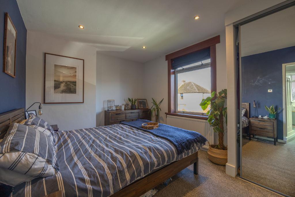 Spacious master bedroom offers space for a king size bed and free-standing furniture. The bedroom benefits from fitted wardrobes with mirror sliding doors, an open cupboard with shelving, plus a walk-in cupboard with shelving, light and Velux window, providing generous storage space. Window overlooking the front. Carpet to floor.