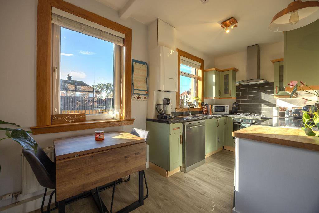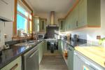 Fitted kitchen with space in front of a window for table and chairs if required. The kitchen area is fitted with modern wall and floor minted units, 4 ring gas hob, electric oven with extractor above. Sink and drainer positioned in front of window overlooking the rear garden. Splash back tiling and ample worktop surfaces. Brick effect tiling to hob area. Space and plumbing for dishwasher. The boiler is located in the kitchen. A side door provides access to an external store which has fitted shelving, power, light, plumbing and space for washing machine, an ideal spot for the laundry.