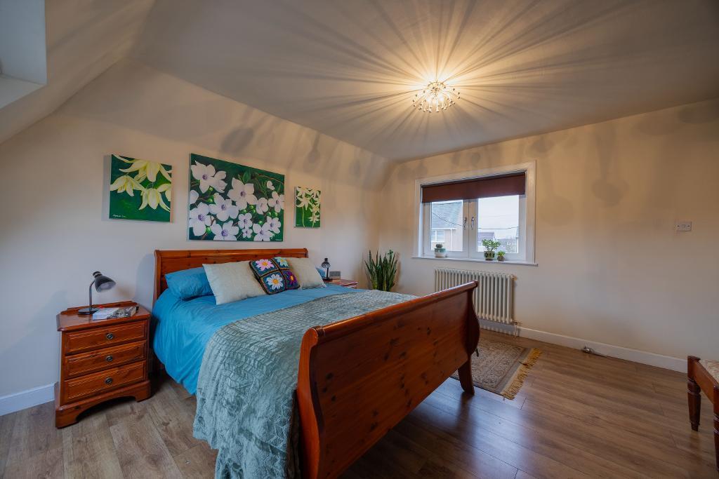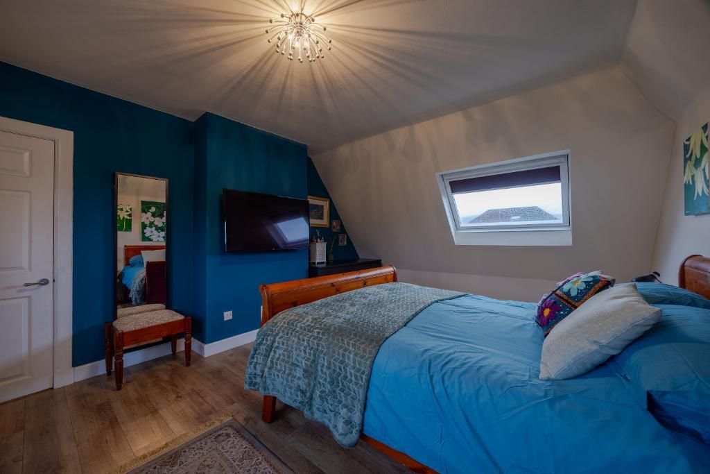 Generous sized master bedroom allowing space for a super king size bed and free-standing furniture. Velux window to front offers partial views towards The Campsie Hills in the distance and two windows overlook the rear. Laminate flooring. Chest of drawers, wall mirror and tv-bracket included in sale.