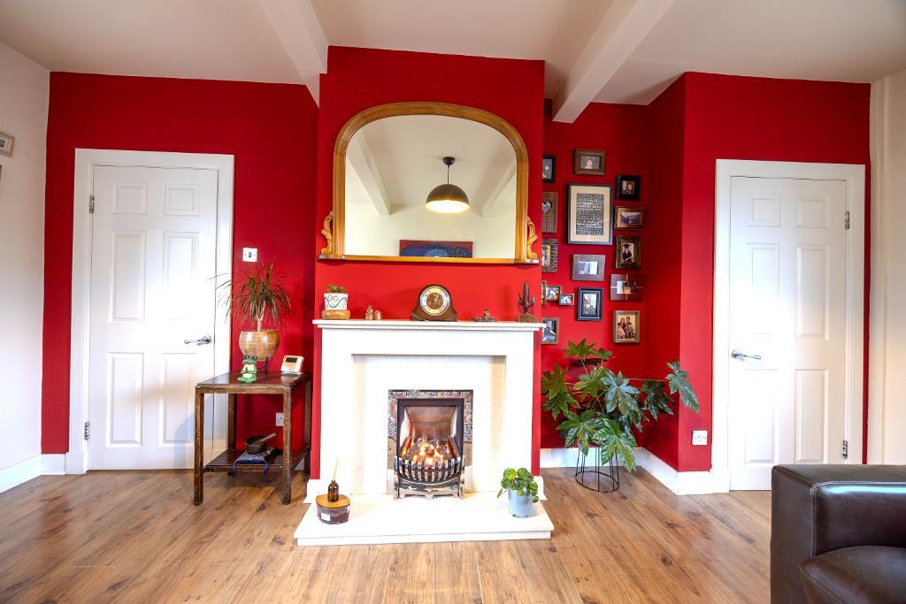 Charming lounge with feature painted wall, living flame gas fire and stylish surround offering a warmth focal point to the lounge. An abundance of natural light is provided with a window to front offering partial views between/over roof tops towards The Campsie Hills in the distance and a second window overlooking the rear garden. A door opens to the kitchen.