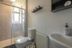 The shower room includes a wc, pedestal wash hand basin, shower cubicle with electric shower and sliding shower screen. Bathroom cabinet. Wet wall panelling within shower cubicle. Half wall panelling partially to one wall and wood panelling to ceiling. Windows offering natural light and ventilation electric shower sliding shower screen. LVT flooring.
