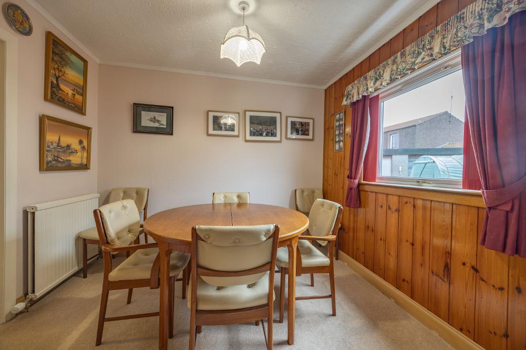 The lounge benefits from a large window formation to front providing an abundance of natural light. Within the lounge there is a feature electric living flame fire and fitted display shelving. The lounge is partially open plan to the dining area which offers ample space for dining furniture. Fitted carpet. Window to side and a door opens to the kitchen.