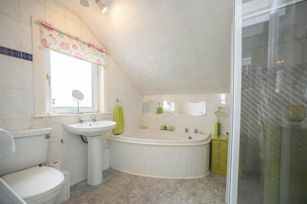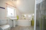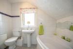 Mezzanine level four-piece bathroom includes, wc, wash hand basin, corner bath and shower cubicle with electric shower. A frosted double-glazed window provides natural light and ventilation. Partial tiling to walls.