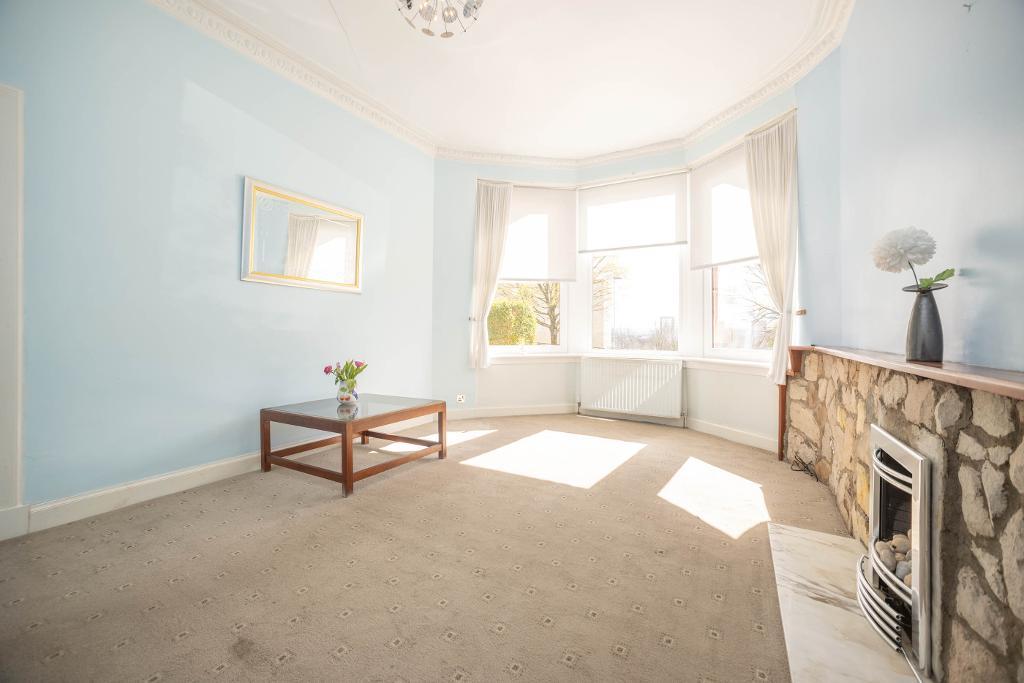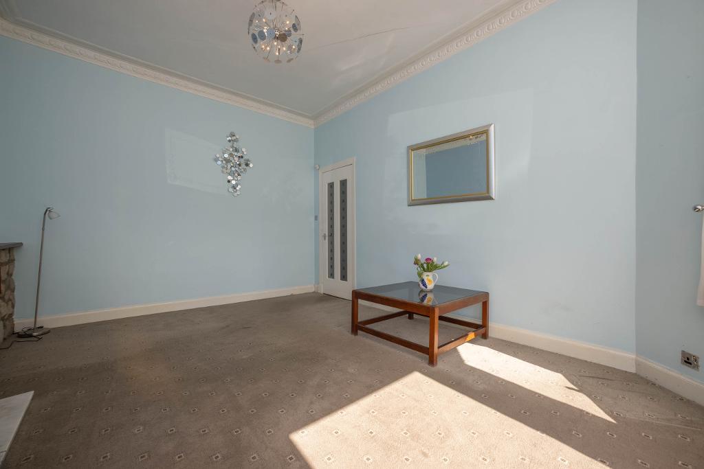 Generous sized sitting room with high ceiling and bay window formation to front, allows natural light into this room, as well as offering views over Glasgow towards Eaglesham in the distance. Decorative cornicing to ceiling. Fitted carpet to floor. Stone fireplace with gas fire. This room can be utilised as a lounge if you prefer.