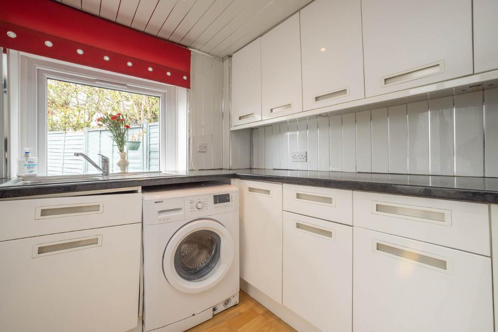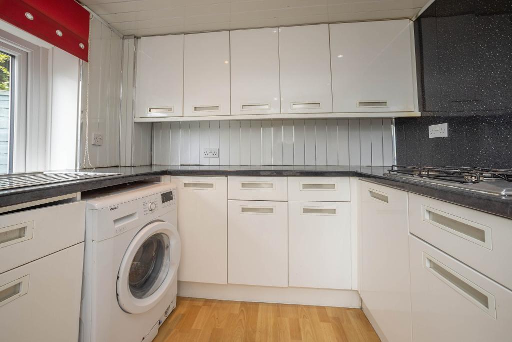 Fitted kitchen with base and wall mounted units. Ample worktop area, sink unit and drainer positioned in front of double-glazed window overlooking the rear garden. Gas hob, washing machine and fridge freezer are included in the sale. Laminate flooring. Recessed spotlights to ceiling. A side door provides access out to the rear garden.