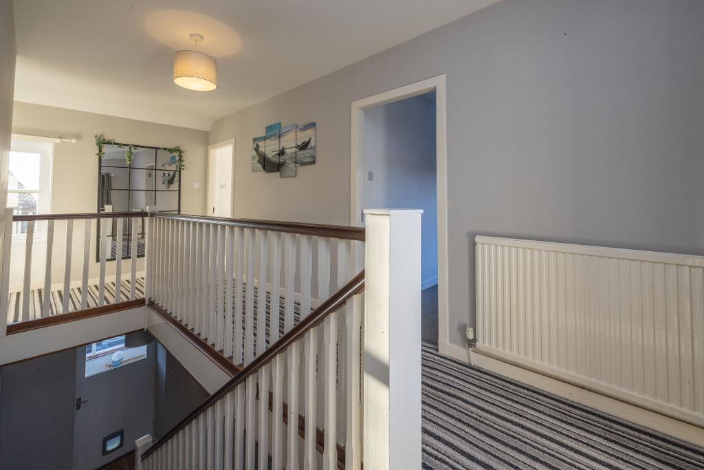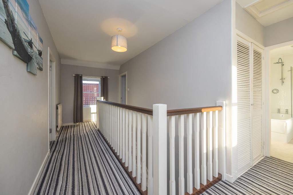 Staircase with carpet runner leads to spacious upper floor landing, which offers access to three bedrooms and bathroom. Two sash & case windows allow natural light into the upper landing as well as providing a view to front over rooftops towards farmland in the distance and view over the rear garden towards The East & West Lomond Hills. Cupboard housing the boiler and providing storage space. Hatch to attic.