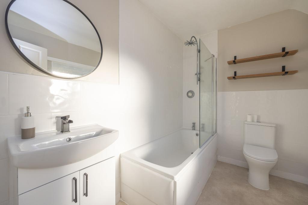 The bathroom is fitted with a white suite and includes, wc. wash hand basin with vanity unit, bath with mixer shower and shower screen. Sash & case window providing natural light. Partial tiling to walls. Display shelving. Linoleum flooring.