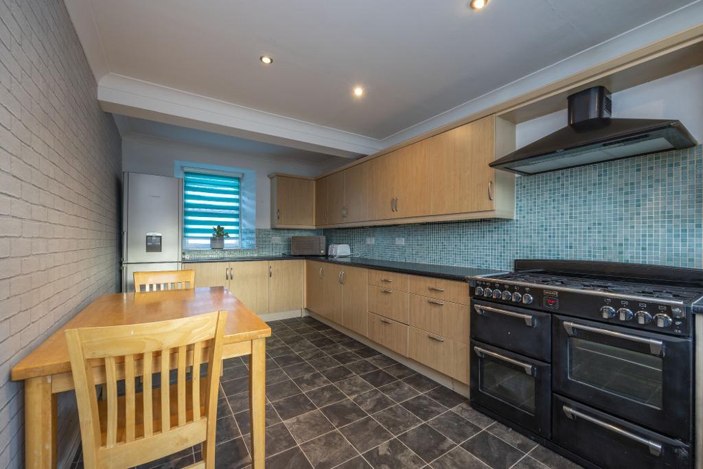 Breakfasting sized kitchen with fitted wall and floor mounted units. Generous worktop space with mosaic splash back tiling. Free standing range style gas cooker, fridge freezer and dishwasher included in the sale. Space and plumbing for washing machine. Sink unit and drainer positioned in front of sash & case windows overlooking rear garden. Space for table and chairs. Feature wallpaper to one wall. Sash & case window with deep windowsill to front. Linoleum flooring.