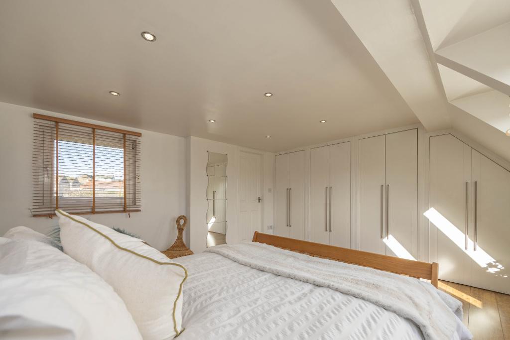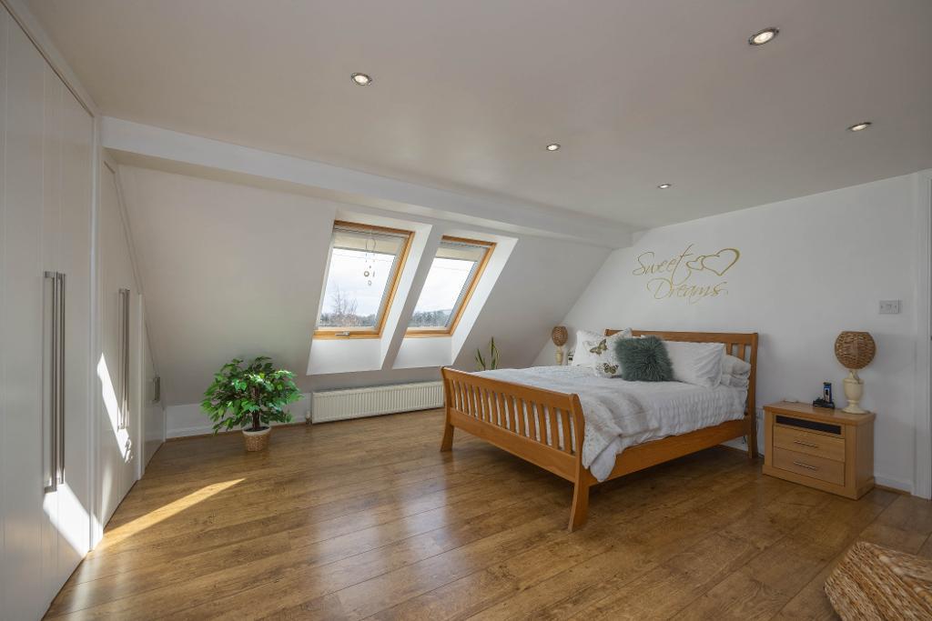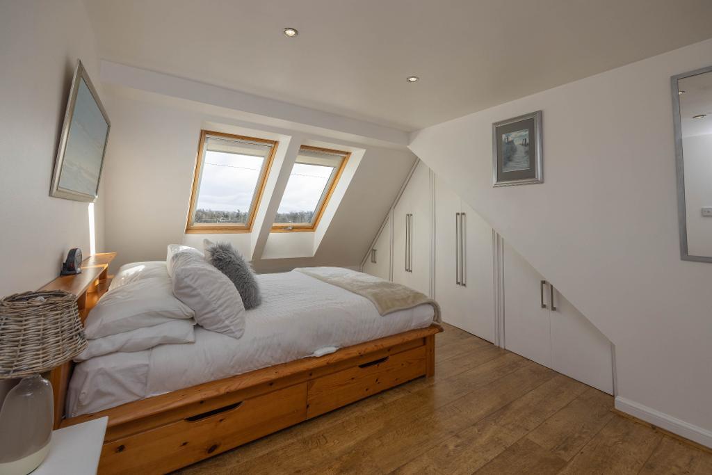 Master Bedroom offering a vast amount of space for double bed and free standing furniture. This room has been beautifully finished. Fitted wardrobes, walk in wardrobe area, two Velux windows, offers lovely views over nearby farmland and towards The East Lomond. Window overlooking the rear. A door opens onto the en-suite.