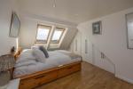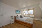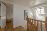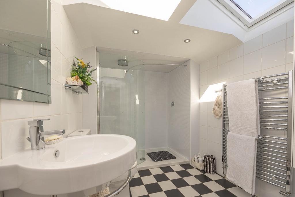 Spacious en-suite shower room includes wc, wall hung sink, walk-in double shower cubicle with fixed shower screen and rainfall shower head. Towel Style radiator. Tiling to floor and walls. Two Velux windows providing natural light and ventilation.