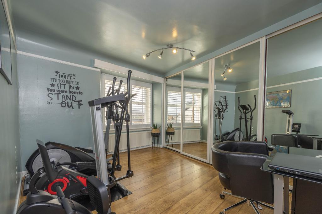 Bedroom three is a generous sized double bedroom, space for double bed and free standing furniture. Fitted wardrobes with mirror sliding doors. This room is currently being utilised as a gym and work from home area. Windows providing partial views over nearby farmland and towards The East Lomond. Fitted window shutters.