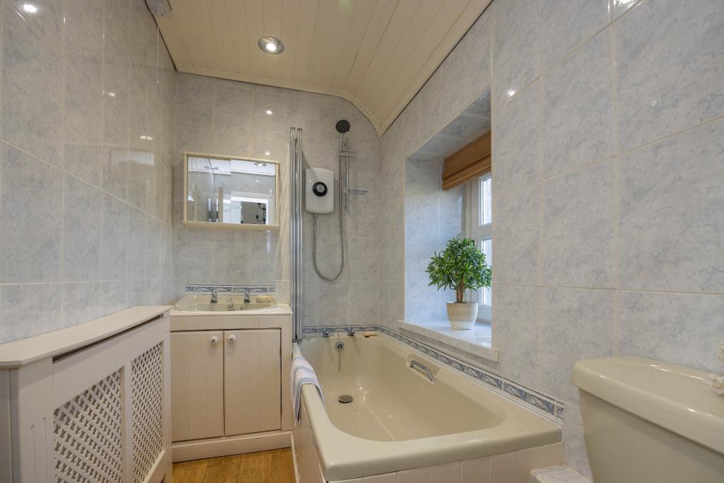 Three piece bathroom comprises wc, wash hand basin vanity unit, bath with electric shower above and shower screen. Tiling to walls. Window providing natural light and ventilation.
