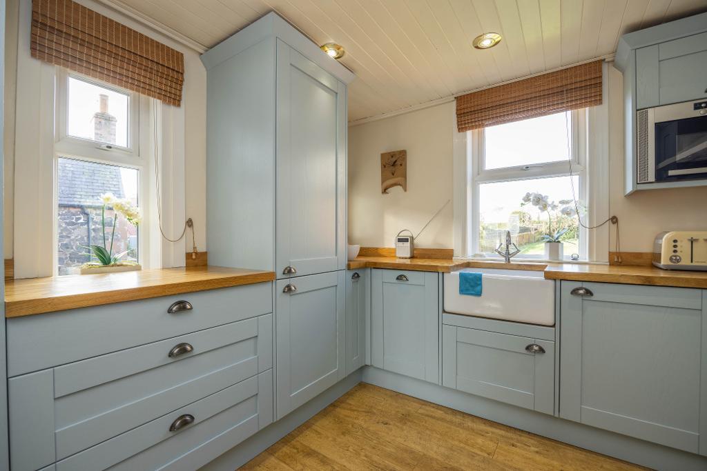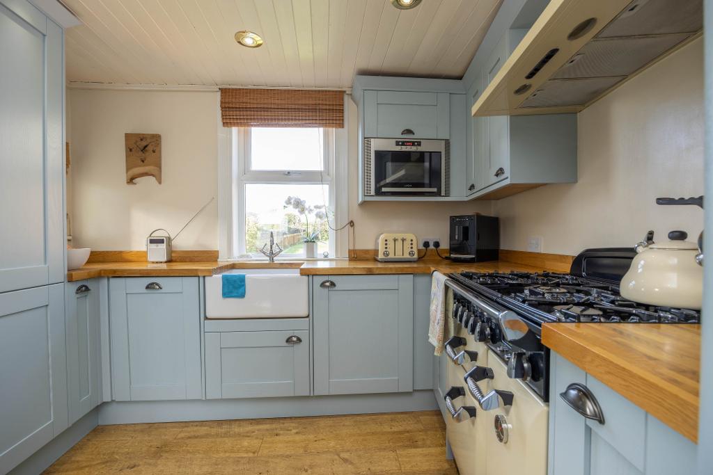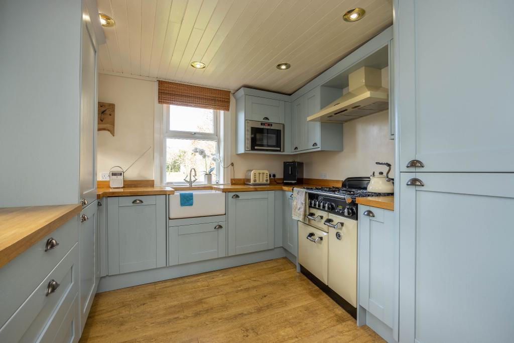 The kitchen has been fitted with chic wall and floor mounted units. Solid oak work tops and Belfast sink. Built-in microwave. Integrated fridge/freezer, washing machine and dishwasher. Three windows provide natural light into the kitchen. Rangemaster cooker may be available by separate negotiation.