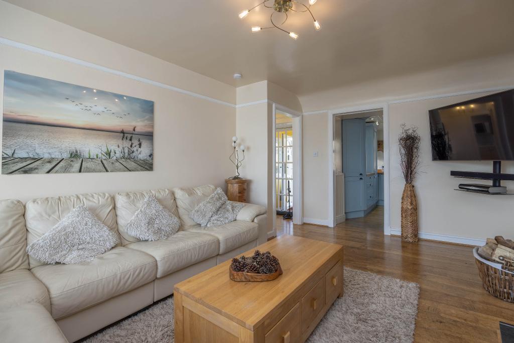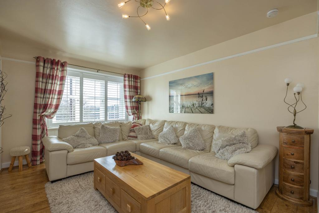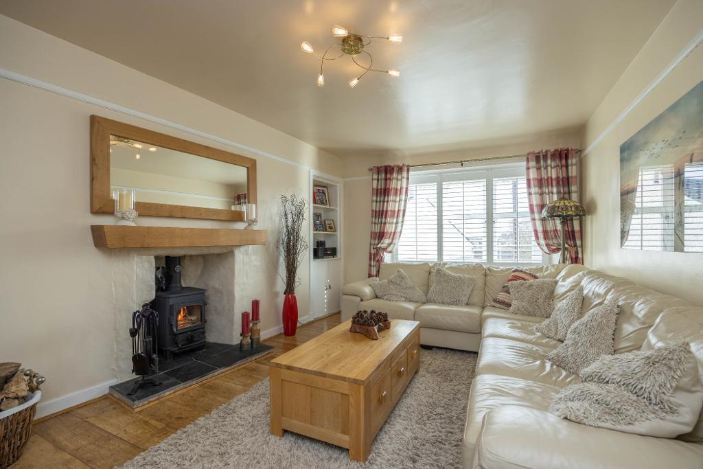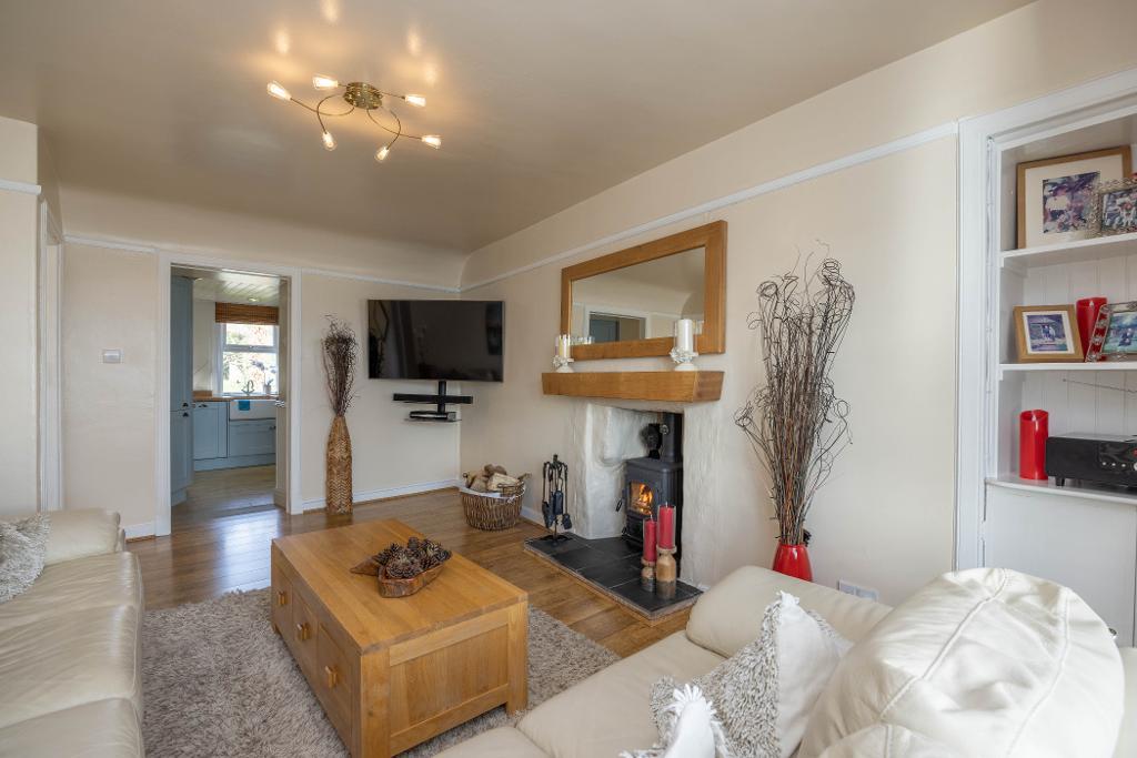 Well proportioned charming lounge with feature multi fuel stove and tiled hearth. Space for table and chairs. Triple window formation offers partial views over nearby farmland towards The East Lomond. Fitted window shutters. Alcove display area with cupboard below housing electric meter.