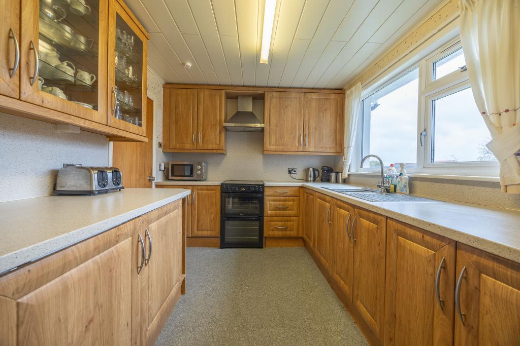Fitted kitchen includes wall and floor mounted units. Ample worktop surfaces with matching splash back. Sink and drainer positioned in front of window overlooking rear garden. Space and plumbing for washing machine. Dishwasher and free-standing electric cooker with extractor above included in sale. Cupboard houses the boiler and electric meter, as well as offering storage. Vinyl flooring.