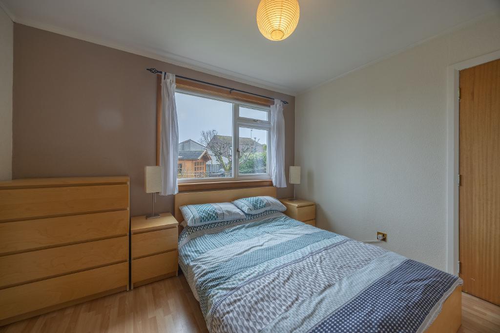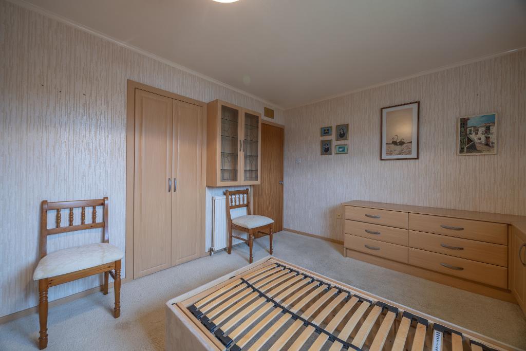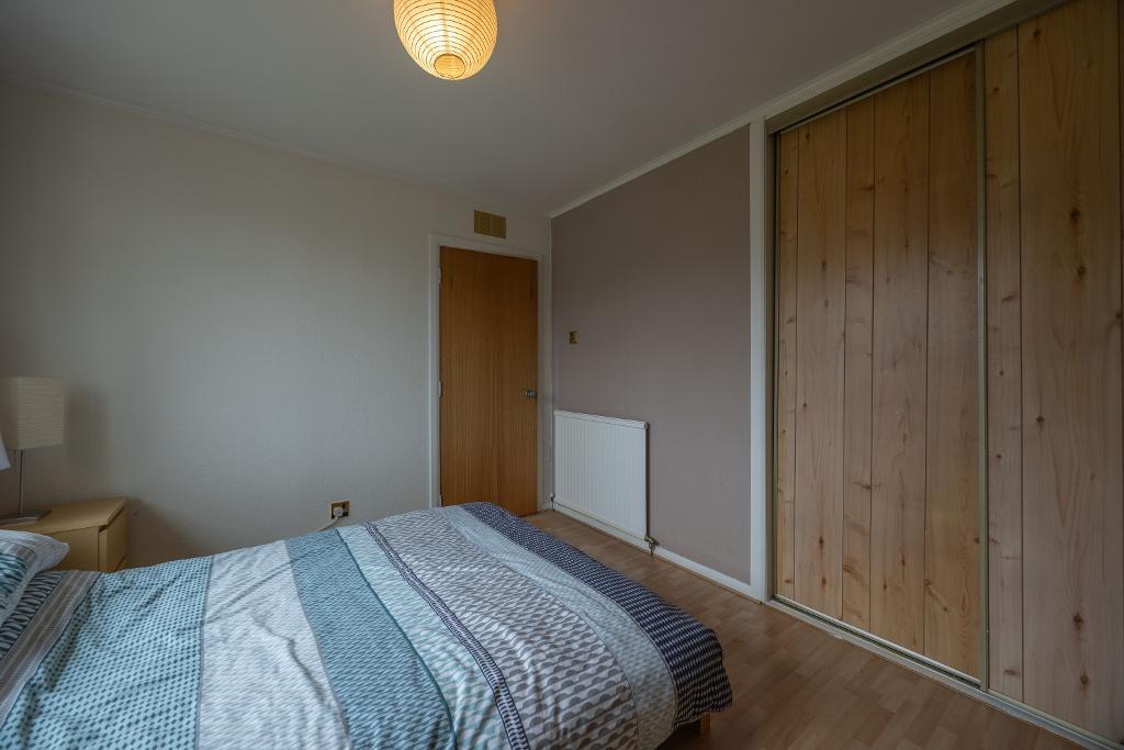 Bedroom three is located to the rear with window overlooking garden area. Ample space for double bed and freestanding furniture. Fitted wardrobe with sliding doors. Laminate flooring.