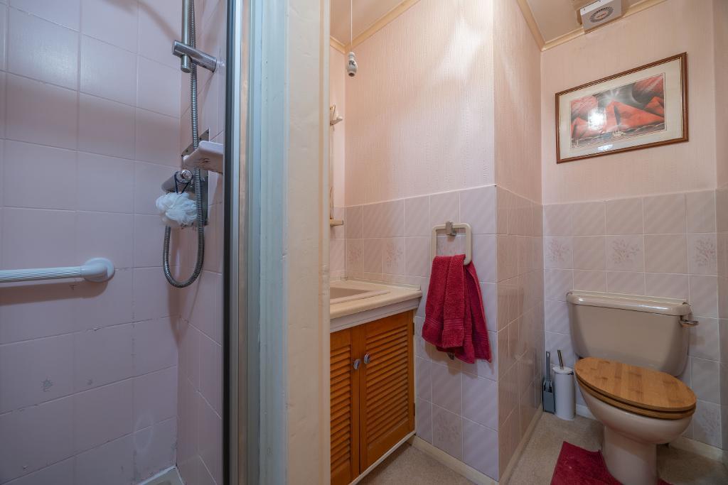 The shower room includes a wc, basin vanity and a shower cubicle with thermostatic shower, tiling to walls and bi folding door. Fitted mirror. The shower room walls are partially tiled. Fitted carpet. Two fitted towel rails.